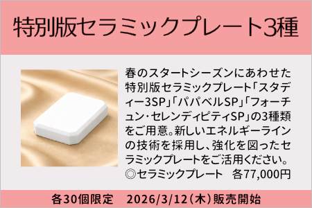 春のスタートシーズンにあわせた特別版セラミックプレート「スタディー3SP」「パパベルSP」「フォーチュン・セレンディピティSP」の3種類をご用意。新しいエネルギーラインの技術を採用し、強化を図ったセラミックプレートをご活用ください。